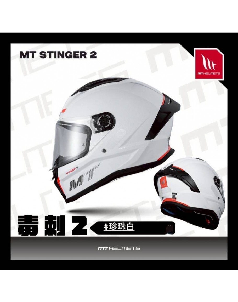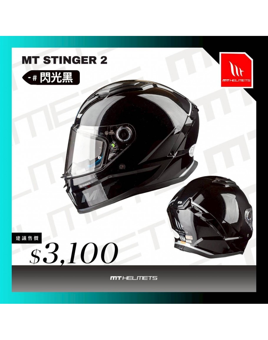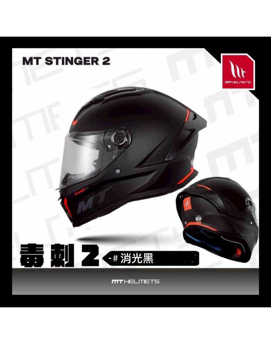MT STINGER2 全罩安全帽,採空氣力學與通風系統設計,降低溫度與濕度,提供舒適騎乘體驗。擴大視野鏡片兼容防霧片,配MT-MDHC插釦式頤帶、MT-QVSS快拆鏡片與鏡片鎖定設計,內襯可拆洗,安全帽底部MT-3PPS三點支撐穩定可靠。通過歐洲、美國與台灣安全認證。