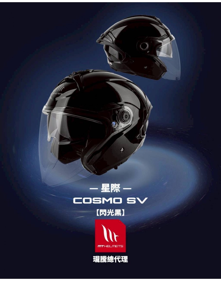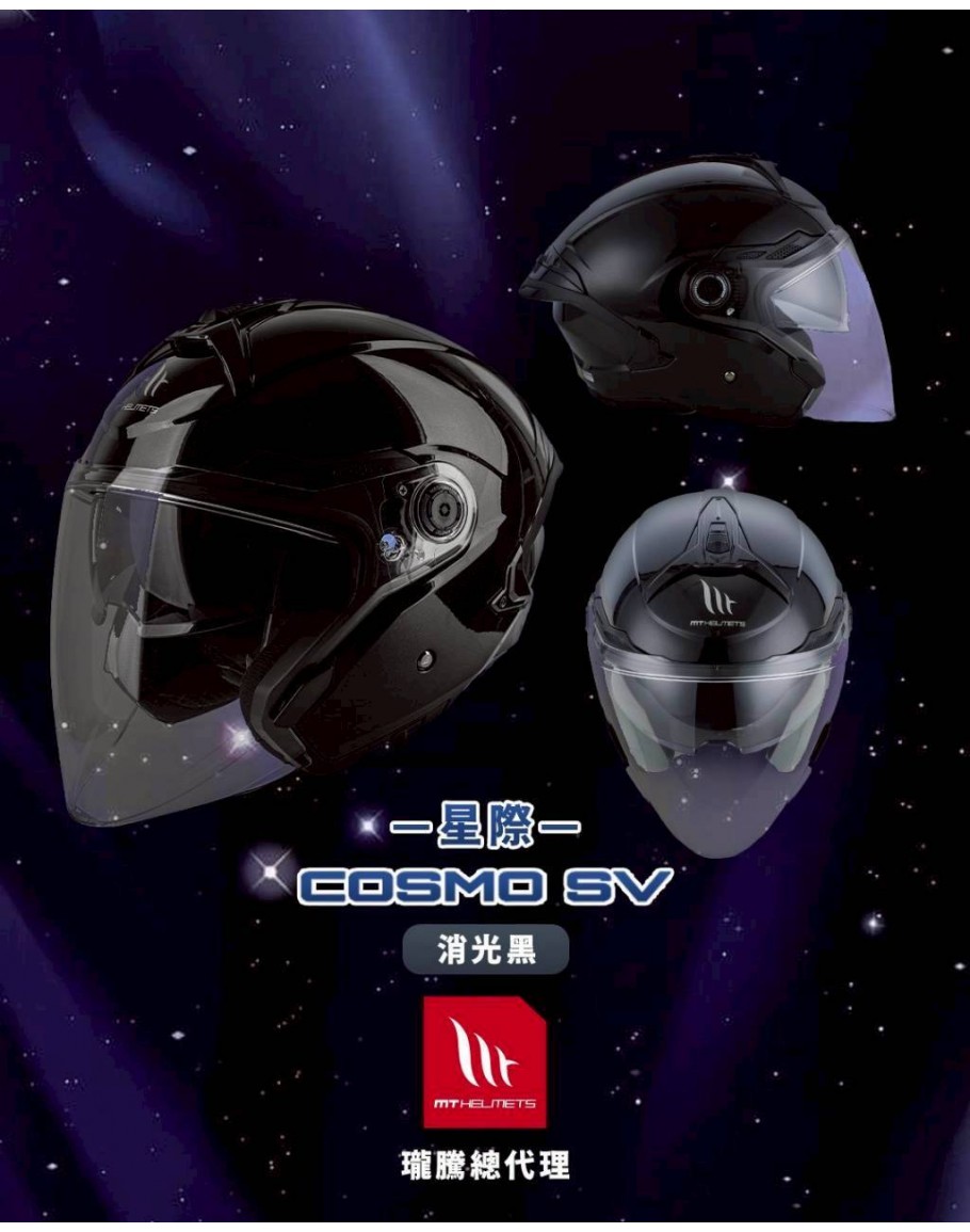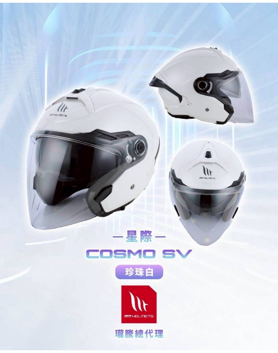 MT COSMO SV半罩安全帽採 MT-QVSS鏡片快拆設計,單手操作內墨片,提升騎乘安全。空氣力學通風系統搭配可拆大鴨尾,涼感舒適並降低風阻。外殼高耐衝擊聚合物,內襯可拆洗,配眼鏡槽與藍牙耳機溝槽。通過 DOT、ECE 22.06、CNS 認證,是追求安全與舒適的騎士首選。